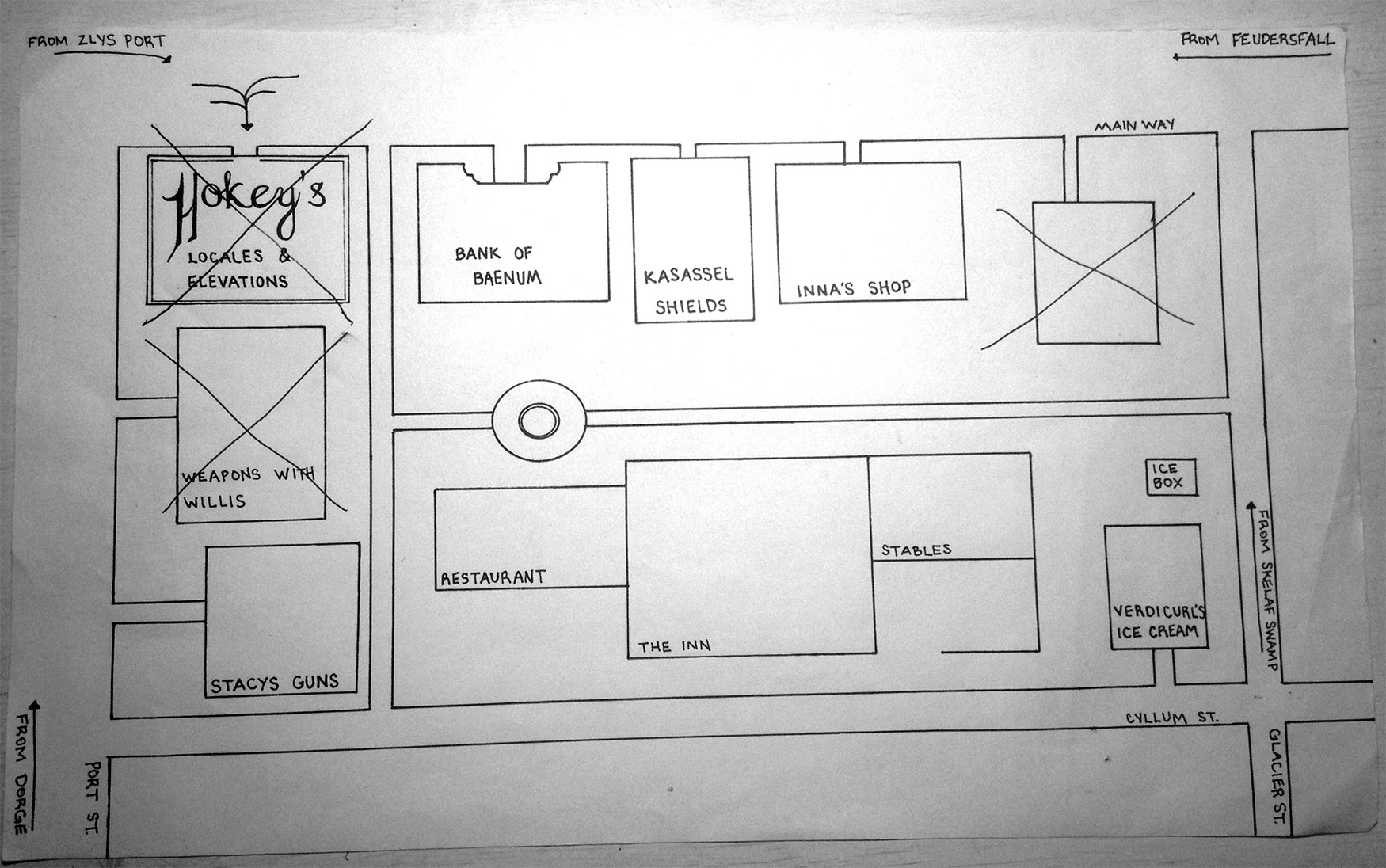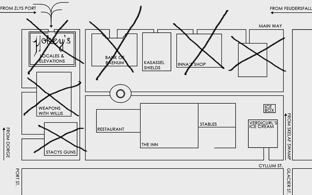 Let’s look back at Hokey’s Business Card. Since arriving in Baenum, buildings have gone missing in one of the town’s blocks. First, the map maker, Hokey, lost his business/home, then the weapon shop and the enchanter’s home went missing.